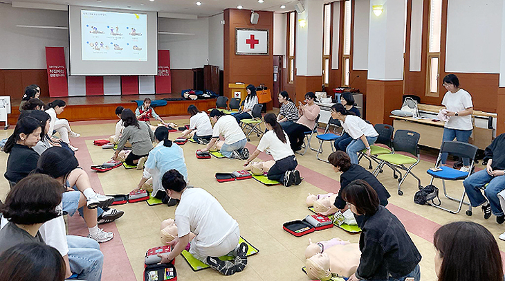 이번 교육은 응급상황에 신속히 대처해 골든타임 내 아이들의 생명을 살릴 수 있는 역량을 기르기 위해 연령별 심폐소생술, 자동심장충격기 사용 방법 및 상황별 응급처치 등의 내용으로 구성됐다.