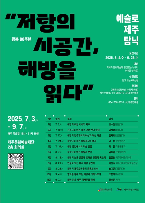 [한라일보] 사단법인 제주민예총이 광복 80주년을 맞아 도민들을 대상으로 '저항의 시공간, 해방을 읽다'라는 주제로 '예술로 제주탐닉' 아카데미를 연다.