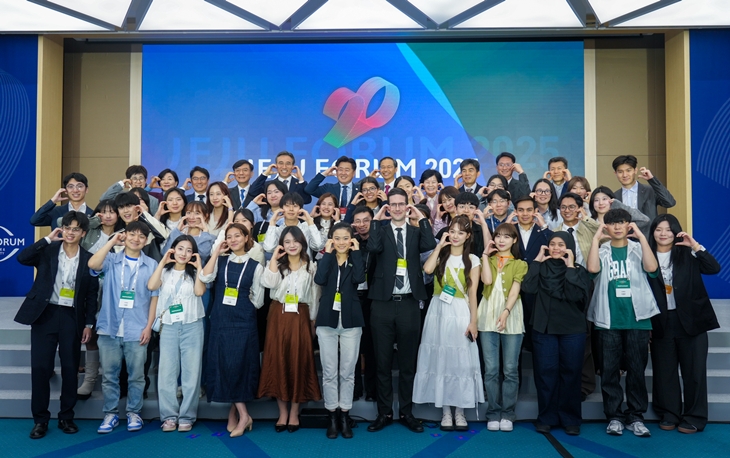 30일 오후 서귀포시 중문동 제주국제컨벤션센터에서 열린 제주포럼 폐막식 후 오영훈 제주지사를 비롯한 참가자들이 기념촬영을 하고 있다.