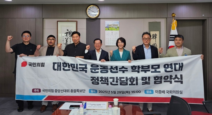 지난 29일 국회 이종배 의원실에서 열린 국민의힘 중앙선거대책위원회 총괄특보단과 대한민국운동선수 학부모연대의 체육정책 간담회에서 참석자들이 기념촬영을 하고 있다.