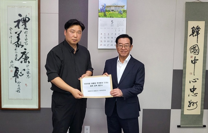 지난 29일 국회 이종배 의원실에서 열린 국민의힘 중앙선거대책위원회 총괄특보단과 대한민국운동선수 학부모연대의 체육정책 간담회에서 김창우 학부모연대 회장이 이종배 의원에게 국민의힘 대통령 후보에게 드리는 체육 정책제안서를 전달하고 있다.