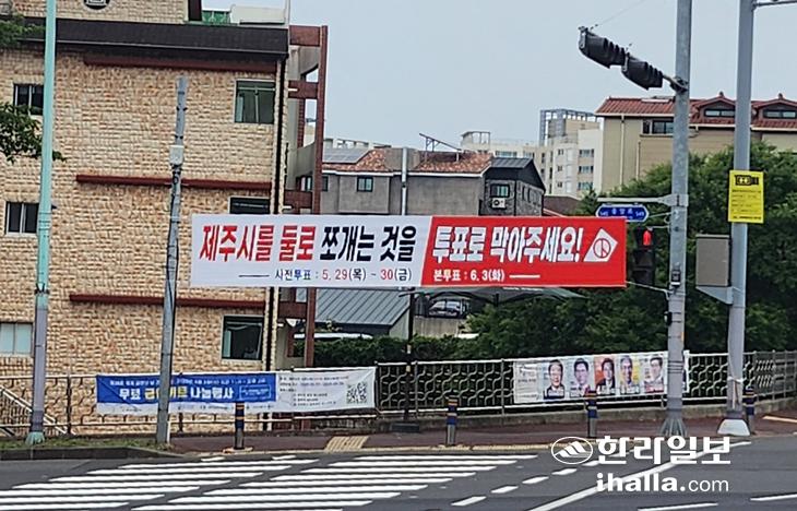 국민의힘 제주특별자치도당은 지난 29일 제21대 대통령선거 사전투표를 앞두고 제주시내 곳곳에 '제주시를 둘로 쪼개는 것을 투표로 막아달라'는 내용의 현수막을 내걸었다.