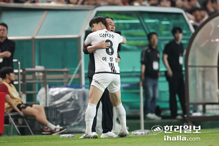 올 시즌 첫 골을 넣고 김학범 감독과 포옹하는 제주 이창민. 한국프로축구연맹 제공