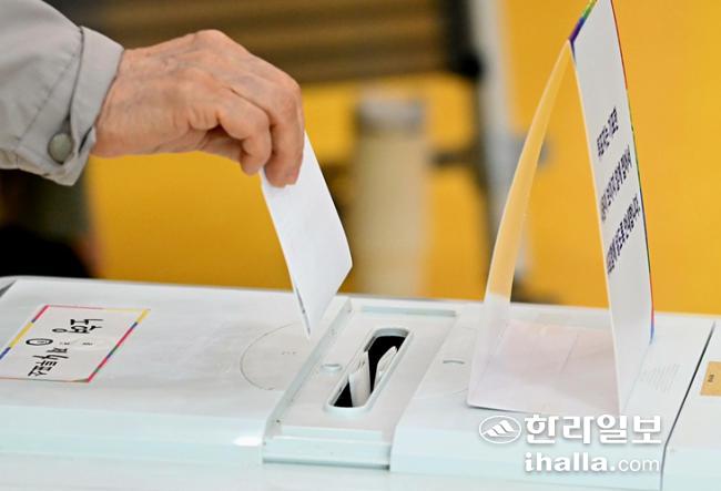 제21대 대통령선거일인 3일 오전 제주시 노형동 제4투표소가 마련된 한라초 체육관에서 한 유권자가 투표하고 있다. 강희만 기자