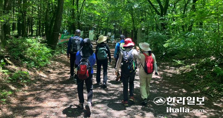 3일 전문가와 함께하는 힐링 체험트레킹 참가자들이 사려니숲길을 걷고 있다.