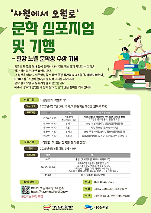 사전 신청은 네이버 링크(https://naver.me/FW0kQpuw) 등에서 하면 된다. 자세한 사항은 제주작가회의(전화 070-8844-2525)로 문의하면 된다.