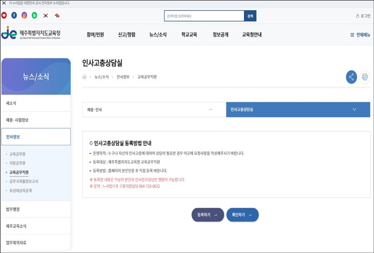 제주도교육청 누리집에 개설된 \'인사고충상담실\'.