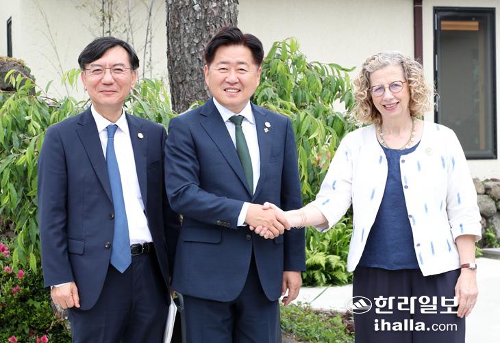 오영훈 제주지사가 4일 세계환경의 날을 맞아 제주를 방문한 잉거 안데르센 유엔환경계획(UNEP) 사무총장과 악수를 나누고 있다. 제주자치도 제공