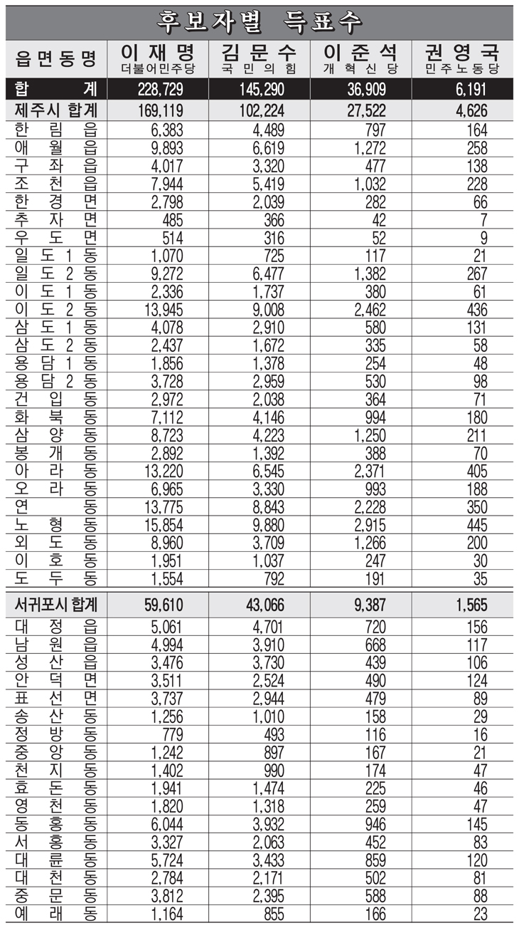 이재명 후보, 성산읍 제외 42개 읍면동서 득표수 1위