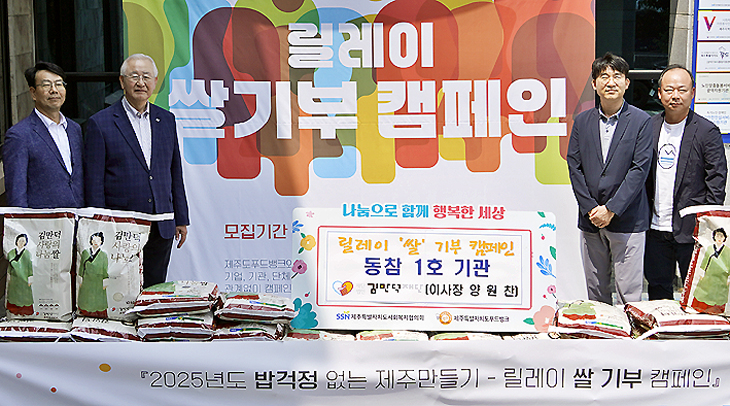김만덕재단(이사장 양원찬)은 4일 '2025 밥걱정 없는 제주 만들기-릴레이 쌀 기부 캠페인'첫 번째 동참 기관으로 제주도푸드뱅크(대표 고승화)에 쌀 1000㎏을 전달했다.