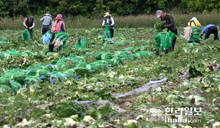 [한라일보] 4일 서귀포시 표선면 성읍리 한 농경지에서 농민들이 배추 수확 작업을 하고 있다. 강희만기자