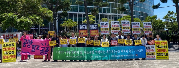 제2공항강행저지비상도민회의가 5일 제주국제컨벤션센터 앞에서 기자회견을 열고 있다. 도민회의 제공