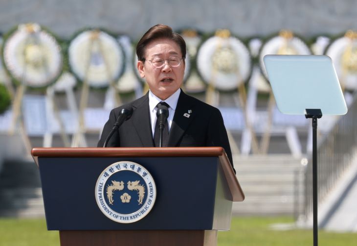 이재명 대통령이 6일 서울 동작구 국립서울현충원에서 열린 70회 현충일 추념식에서 추념사를 하고 있다. 대통령실통신사진기자단