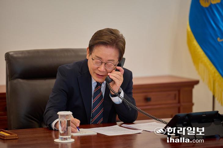 이재명 대통령이 9일 서울 용산 대통령실에서 이시바 시게루 일본 총리와 전화 통화를 하고 있다.