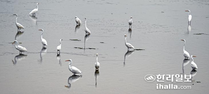 [한라일보] 21일 제주시 구좌읍 하도리 철새도래지를 찾은 중대백로들이 해변에서 휴식을 취하고 있다. 강희만기자
