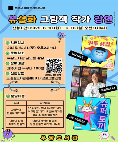 제주시 우당도서관은 '책보고 어린이 독서습관 기르기' 사업의 일환으로 이달 21일 오후 2시 꿈오름 강당에서 '장갑 시리즈'로 알려진 유설화 그림책 작가 초청 강연을 연다.