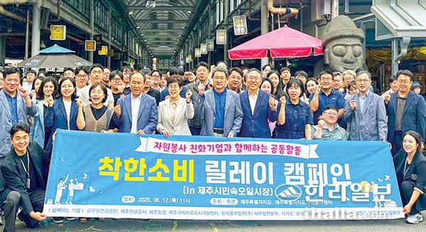 [한라일보] 제주특별자치도자원봉사센터(센터장 손영준)는 12일 도내 자원봉사 친화 기업 8개 기관과 함께 제주시민속오일시장에서 지역 경제에 활력을 불어넣기 위한 '착한소비 릴레이 캠페인'을 벌였다.