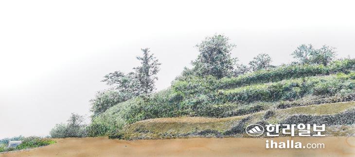 마을 중장년층들에게서 공통적으로 듣게 되는 마을의 역사는 이렇다. "돌빌레(암반) 하고 평생 싸우며 살다 간 사람들의 땅" 작은 봉우리만큼 솟은 언덕마루를 개간해 농경지로 만드는 과정을 그리려 한 것이다. 그 피땀 어린 시간성을 풍경화라는 이름으로 그리게 된 것이다. 저 계단식 밭을 만들기 위해 화산섬 특유의 현무암들을 얼마나 깨고 부숴서 나르는 작업을 했을까? 토목전문가와 역사학자들이 노동량 조사를 품샘으로 풀어 항목별 일위대가표를 만들어서 조상들의 집념 강도를 측정해보고 싶었다. 이 마을의 대부분 농경지들이 설촌 후 500년 이런 개척의 역사라는 사실을 이 풍경화를 통해 알리고 싶은 마음이다.