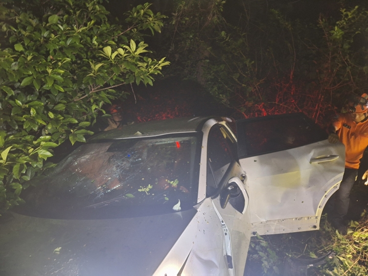12일 오후 10시 서귀포시 안덕면 사계리의 한 도로를 달리던 렌터카가 이탈 사고를 당했다. 도소방안전본부 제공