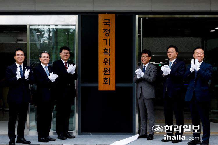 이한주 국정기획위원회 위원장과 김용범 대통령실 정책실장, 더불어민주당 진성준 정책위의장 등 참석자들이 16일 서울 종로구 정부서울청사 창성동 별관에서 열린 국정기획위 현판식에서 손뼉 치고 있다. 연합뉴스