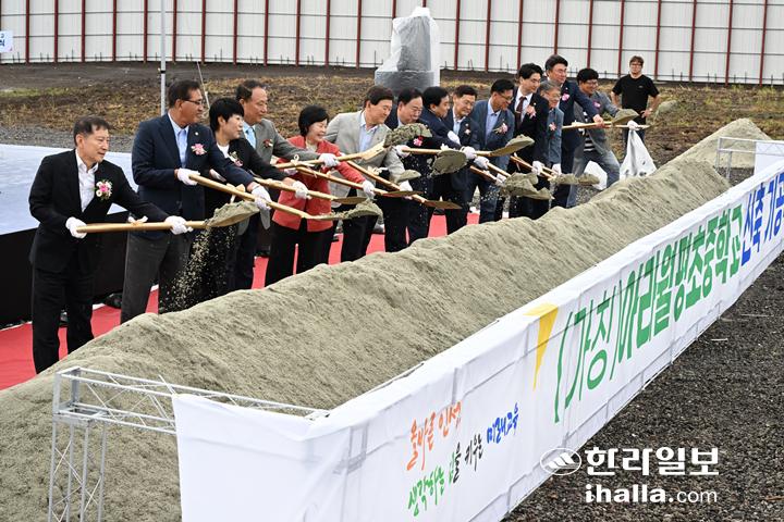 제주특별자치도교육청은 16일 제주시 월평동 신축 부지에서 \'(가칭) 아라·월평초중학교\'기공식을 열었다. 강희만기자