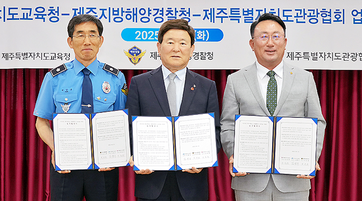 제주특별자치도교육청(교육감 김광수)은 17일 제주종합비즈니스센터 대회의실에서 제주지방해양경찰청, 제주특별자치도관광협회와 안전한 제주 뱃길 관광 환경 조성을 위한 업무 협약을 체결했다.