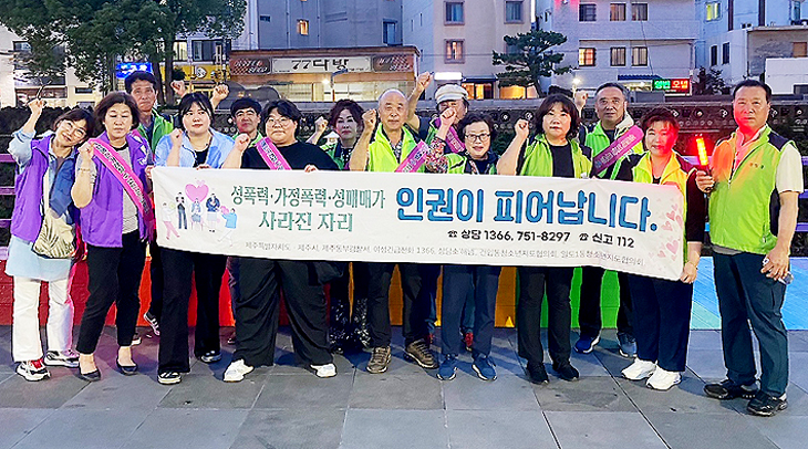제주시는 지난 16일 오후 8시 산지천 일대에서 야간 성매매 근절을 위한 민·관 합동 캠페인을 전개했다. 캠페인에는 성매매 피해자 지원시설인 제주현장센터 '해냄'(센터장 한현진), 여성긴급전화1366제주센터(센터장 전순덕), 건입동청소년지도협의회(회장 이정선), 동부경찰서와 공무원 등 20여 명이 동참했다.