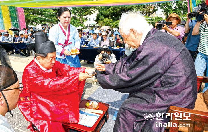 [한라일보] 17일 제주시 제주목 관아 망경루 앞마당에서 열린 '제주양로' 재현 행사에서 제주목사 역할을 맡은 오영훈 제주도지사가 한 어르신에게 차를 따라드리는 전통 의례를 하고 있다. 강희만기자