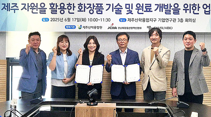 제주산학융합원(원장 이남호)은 지난 17일 향장 제품 연구개발 및 글로벌시장 진출 협력을 위해 (사)전남화장품산업혁신협회, (주)섬섬바이오와 업무협약을 각각 체결했다.