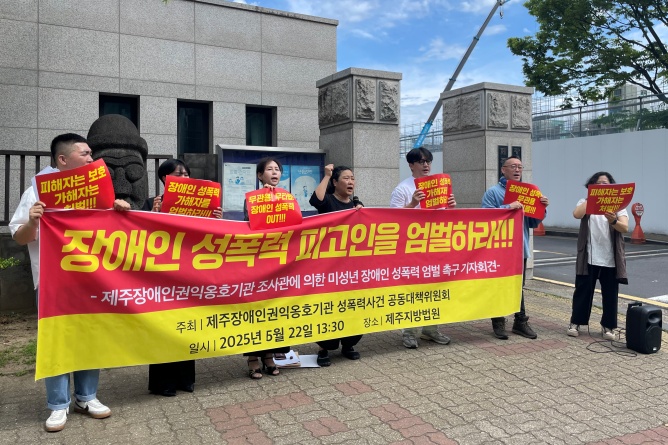 제주장애인인권익옹호기관성폭력사건 공동대책위원회는 19일 오전 제주지방법원 정문 앞에서 기자회견을 열고 제주도정의 재발방지대책 수립과 가해자에 대한 엄벌을 촉구했다.