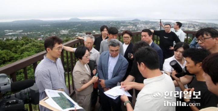 지난 19일 제주 제2공항 건설사업 환경영향평가 절차가 재개된 가운데 현장 방문에 나선 환경영향평가협의회 위원들이 서귀포시 성산읍 대수산봉에 올라 제2공항 예정지를 살펴보며 의견을 나누고 있다. 강희만기자