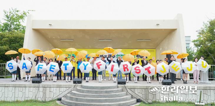 제주도는 21일 제주대학교 야외음악당에서 '안전 최우선 제주 선포식 및 제주 안전지킴이 한마당' 행사를 열었다. 이 자리에서 '도민이 중심이 되는 안전문화' 확산을 목표로 안전문화를 새롭게 정립하고 실천할 '안전 최우선 제주' 비전과 전략을 선포했다.