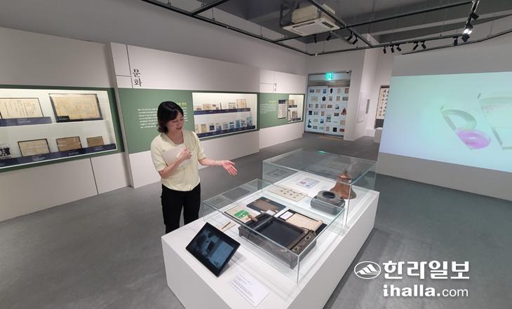 지난 20일 찾은 제주교육박물관 기획전시실에서 강기리 학예연구사가 1950년대 학교 시험지나 안내장을 인쇄하던 등사기에 대해 설명하고 있다. 박소정기자