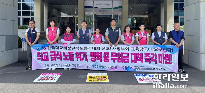 전국학교비정규직노동조합 제주지부는 25일 오전 제주특별자치도교육청 앞에서 기자회견을 열고 "새정부와 교육당국은 학교 급식 노동 위기 대책을 마련하라"고 촉구했다.