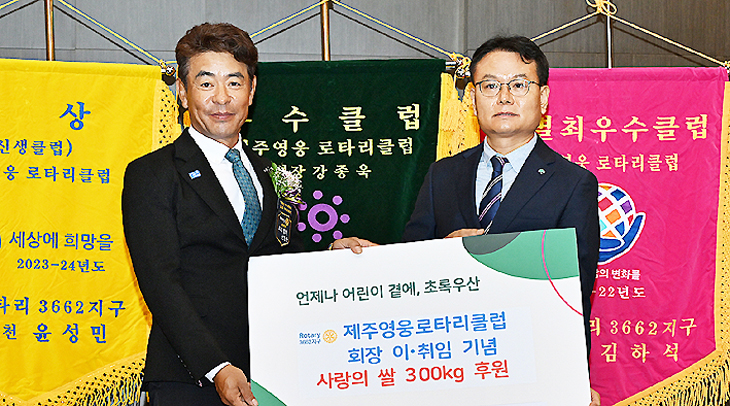 국제로타리3662지구 제주영웅 로타리클럽(취임회장 현석헌)은 지난 21일 회장 및 임원 이사 이·취임식에서 초록우산 제주지역본부(본부장 김희석)에 쌀 300㎏을 전달했다.