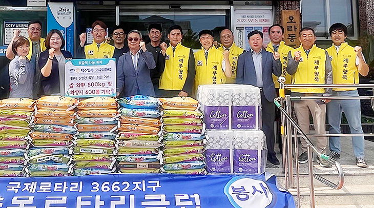 국제로타리 3662지구 제주향목로타리클럽(회장 권영안)은 지난 23일 백미 500㎏과 화장지 600롤을 제주시 오라동(동장 강리선)에 기탁했다.