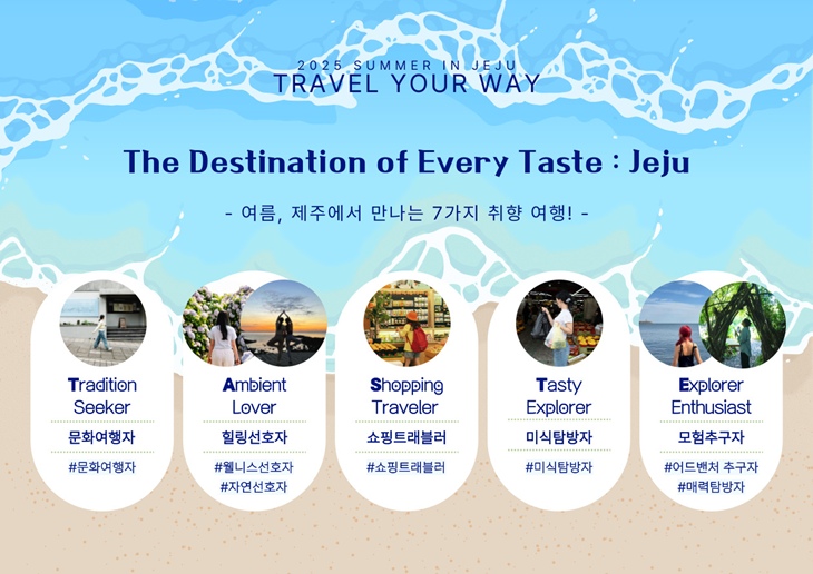 올여름 7가지 제주 취향 여행은 ▷문화여행자(제주 미술, 예술 콘텐츠 경험 추구) ▷웰니스 선호자(여름 요가, 웰니스 활동 선호) ▷자연 선호자(여름꽃 자연 감상 선호) ▷쇼핑 트레블러(원도심 로컬 쇼핑 경험 추구) ▷미식 탐방자(이열치열 vs 이한치열 여름 음식 선호) ▷어드벤처 추구자(가족 용천수 vs 친구 스노클링 경험 추구) ▷매력 탐방자(제주의 숨은 명소, 국가 유산 탐방 추구) 등으로 구성됐다.