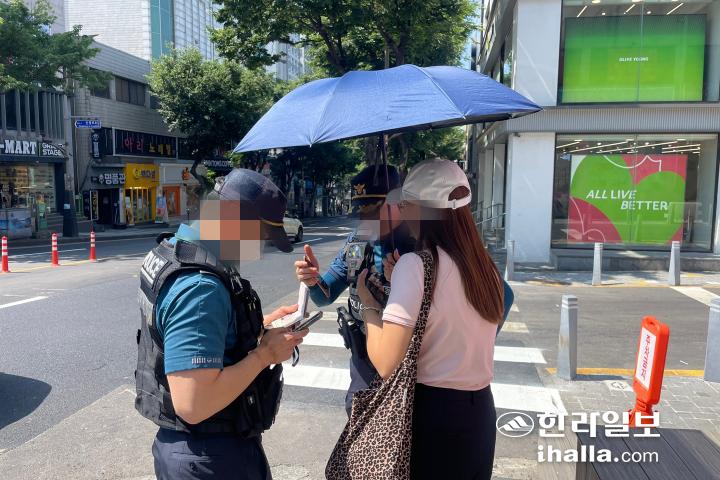 26일 오후 제주시 연동 누웨마루 거리에서 20대 중국인 관광객 2명이 보행자 신호 지시 위반으로 자치경찰에게 적발됐다.