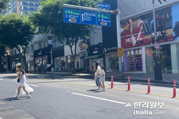 26일 오후 제주시 연동 누웨마루 거리에서 관광객들이 무단횡단하고 있다.