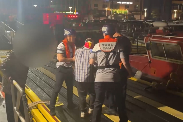 서귀포해양경찰서는 지난 26일 오후 조업 중 머리를 다친 선원을 119구급대에 인계하고 있다. 서귀포해양경찰서 제공