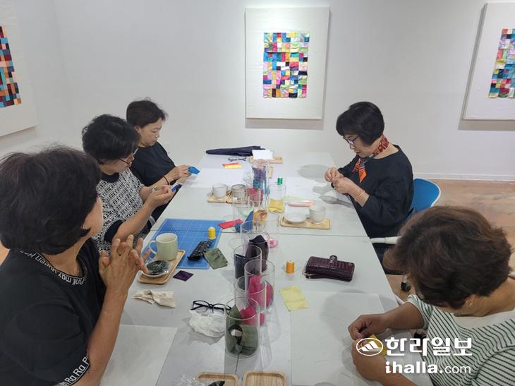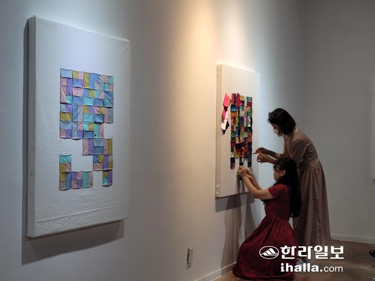 [한라일보] 지난 27일 제주시 삼도동에 있는 예술공간 이아 제2전시실. 형형색색의 네모난 자투리 헝겊들이 놓여있는 테이블마다 삼삼오오의 사람들이 손바느질을 하고 있었다. 적게는 2개에서 많게는 4개까지 원하는 만큼 각자가 고른 헝겊 조각들을 손으로 한땀 한땀 바느질로 엮어 하나의 조각보로 만들었다.