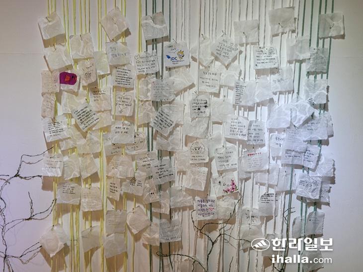 지난 27일 제주시 삼도동에 있는 예술공간 이아 제2전시실에서 '연대의 벽'에 미혼모와 아이들에게 응원을 전하는 메시지들이 적혀있다. 박소정기자