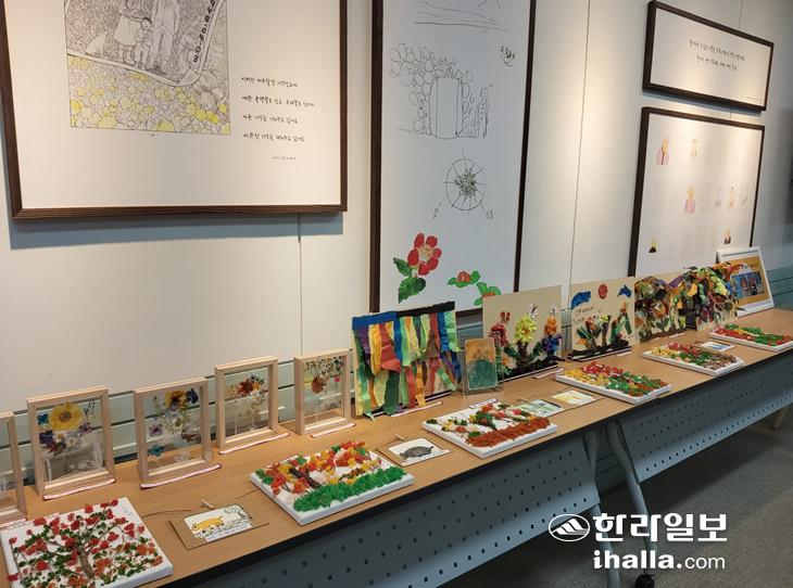 국립제주트라우마치유센터에 미술 치유 프로그램 결과물이 전시되어 있다.