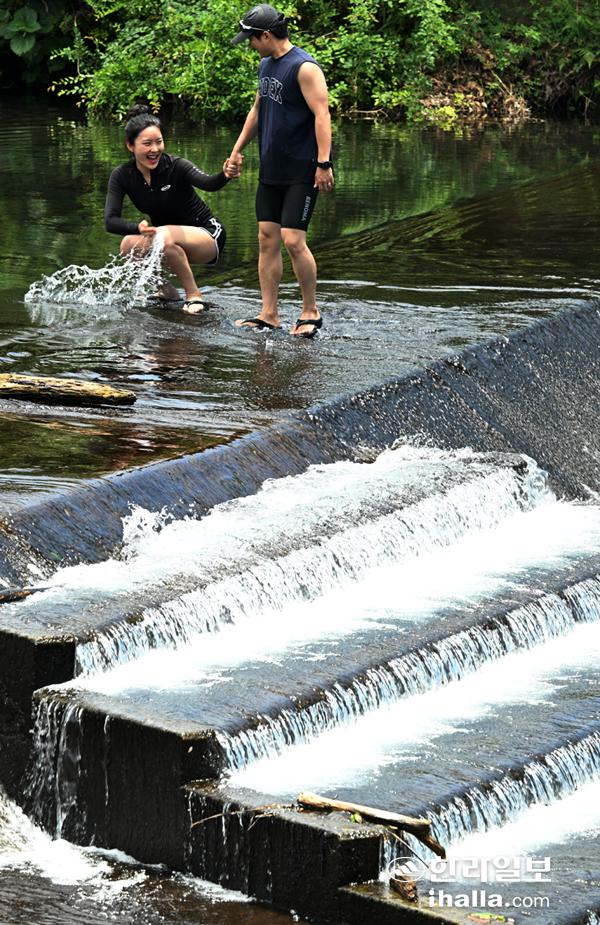 [한라일보] 제주 전 지역에 폭염날씨가 이어진 지난달 30일 서귀포시 강정동 악근천을 찾은 관광객들이 시원한 하천에 발을 담그며 더위를 식히고 있다. 강희만기자