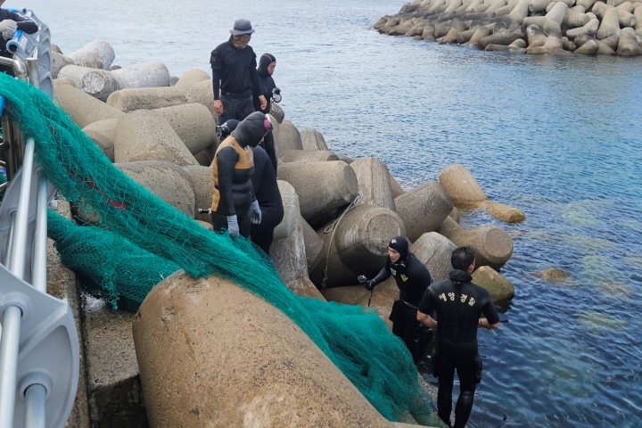 제주해경이 해경특공대원과 해녀, 환경단체와 함께 해양쓰레기를 수거하고 있다. 제주지방해양경찰청 제공