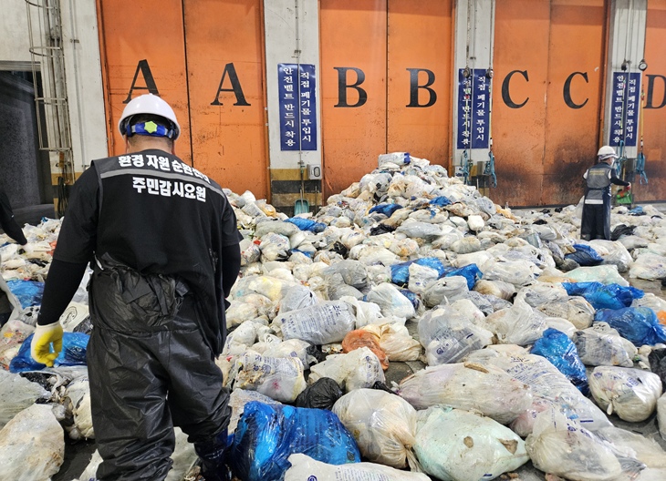동복리·북촌리 주민으로 구성된 주민지원협의체 감시요원들이 3일 제주환경자원순환센터 소각로 입구에서 제주시 지역 가연성쓰레기 수거차량 2대에서 종량제봉투를 모두 내려 재활용품 등이 섞였는지 검사하고 있다. 문미숙기자