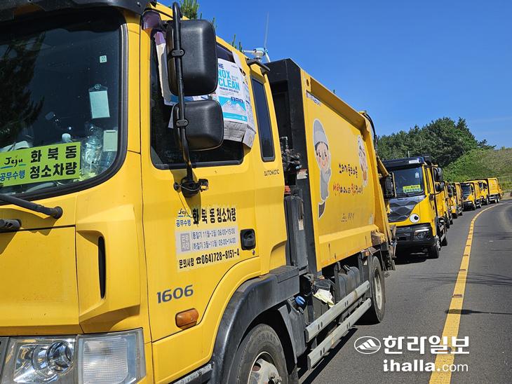 제주시 동복리·북촌리 주민으로 구성된 주민지원협의체 감시요원들이 3일 오전 7시쯤부터 소각로 입구에서 가연성 쓰레기 수거차량 2대에 대한 반입검사를 2시간 넘게 벌이면서 수거차량 30대가 소각장 입구에서 길게 늘어서 대기하고 있다. 문미숙기자
