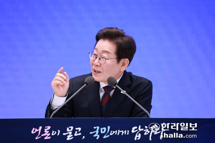 이재명 대통령이 3일 청와대 영빈관에서 열린 '대통령의 30일, 언론이 묻고 국민에게 답하다' 기자회견에서 발언하고 있다. 연합뉴스