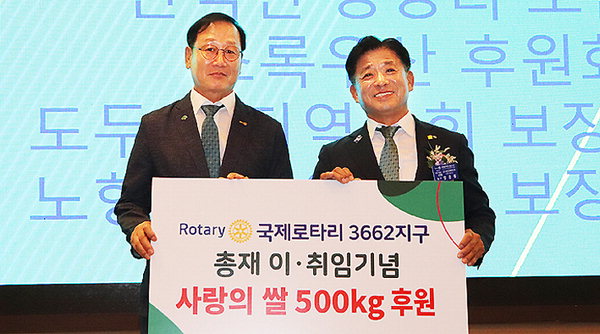 [한라일보] 초록우산 제주지역본부(본부장 김희석)는 지난달 30일 메종글래드 제주에서 열린 국제로타리3662지구 총재 취임식에서 제12대 총재로 취임된 양문봉 총재로부터 쌀 500㎏을 전달받았다.