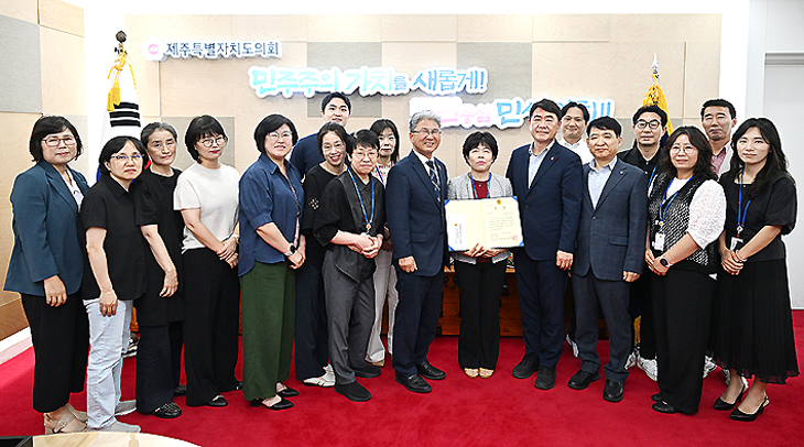 제주특별자치도의회(의장 이상봉)는 7일 오전 도의회 의장실에서 2025년 상반기 의정 홍보 최우수 우수부서로 선정된 농수축경제전문위원회 의사담당관, 우수 부서 문화관광체육전문위원, 장려 부서 보건복지안전전문위원에 대해 시상하고 격려했다.